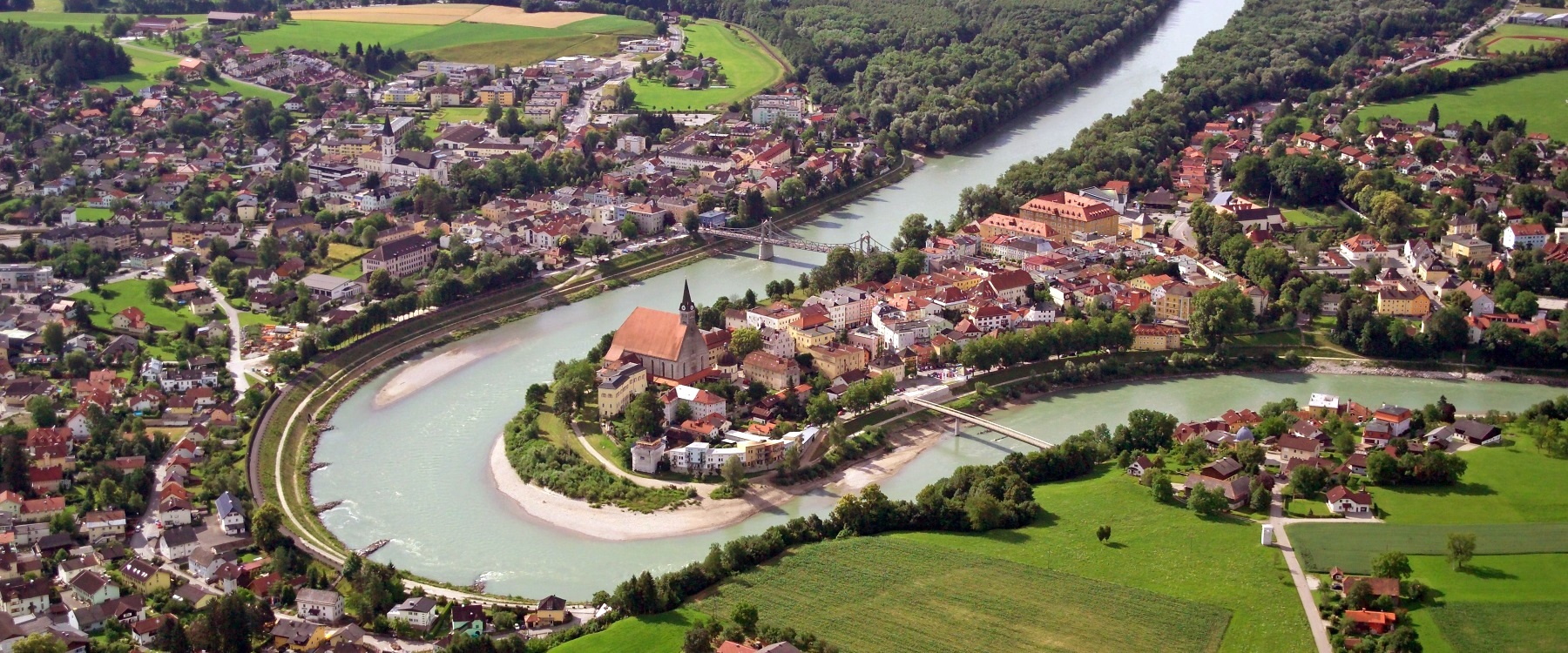 Luftaufnahme von Laufen an der Salzach mit markanter Salzachschleife und Stiftskirche - © Foto Schröck, Oliver Freudenthaler