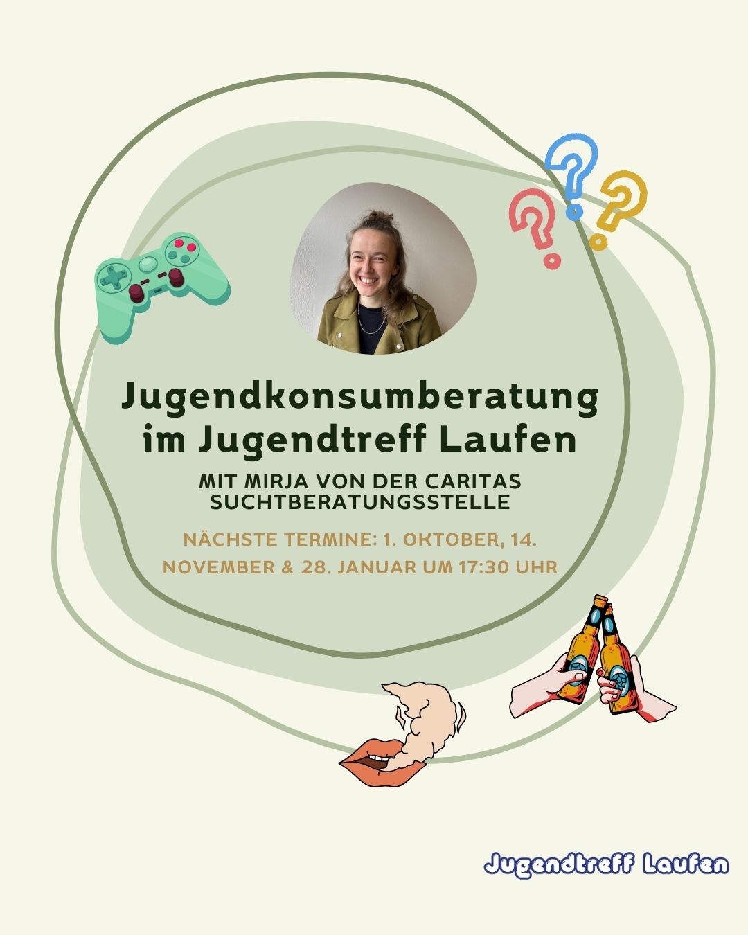 Auch die Caritas Bad Reichenhall ist in 2025 ein regelmäßiger Gast im Jugendtreff Laufen sein. Mit einem Suchtberatungsangebot bieten Lisa Weichselmann und Mirja Uphaus von der Caritas ein offenes und vertrauliches Ohr für alle Fragen rund um das Thema Sucht & Abhängigkeit. Traut euch vorbeizukommen, um eure Fragen zu stellen!