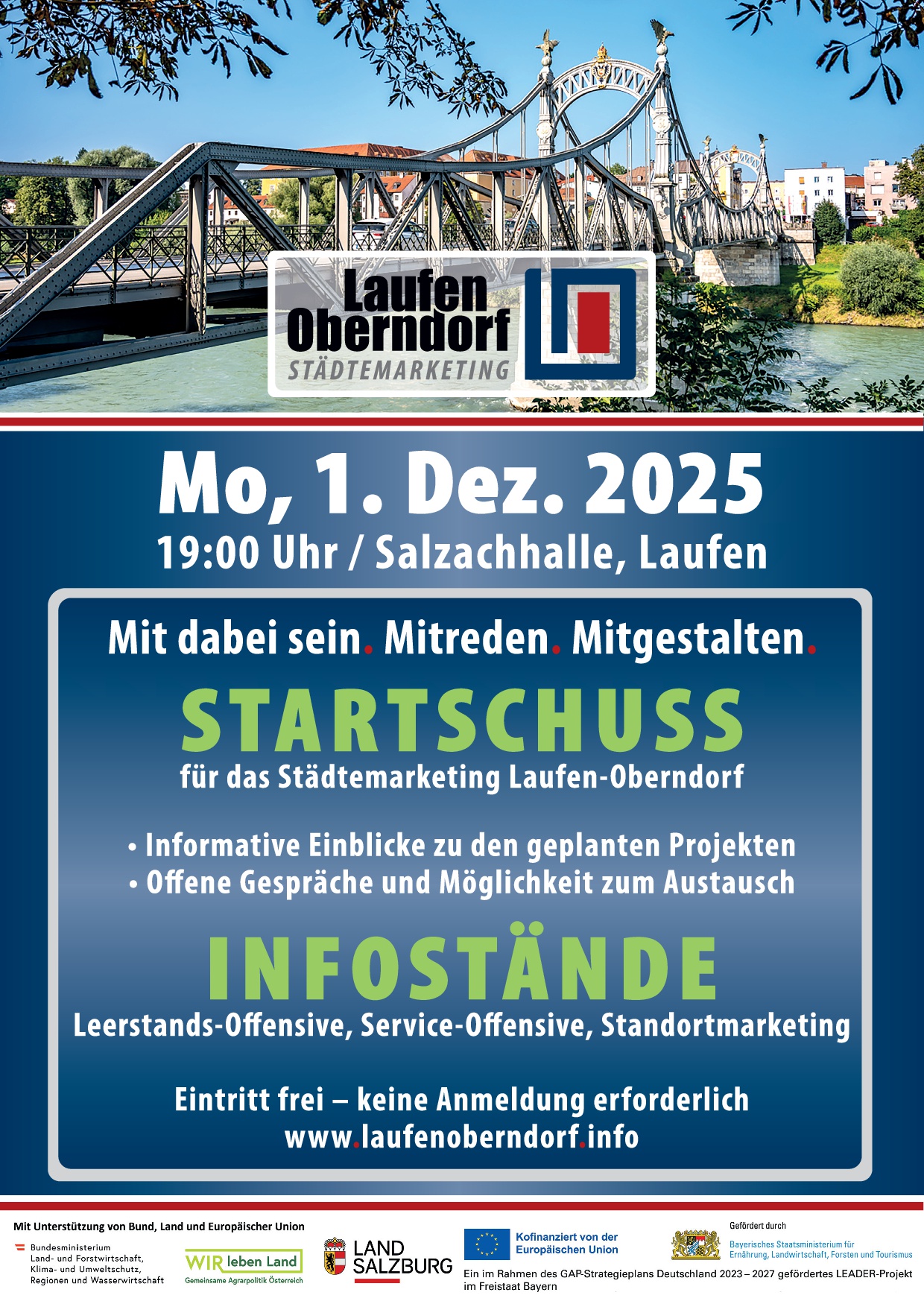 Am 1.12.2025 um 19:00 Uhr findet die Kick-Off Veranstaltung für das Städtemarketing Laufen-Oberndorf in der Salzachhalle statt. Hierbei werden informative Einblicke zu den geplanten Projekten gegeben, sowie die Möglichkeit für offene Gespräche und Austausch zum Thema geboten.
